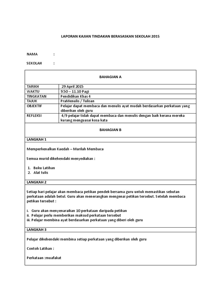 Blog dan kad imbasan dalam pengajaran dan pembelajaran. Mahu membuat kajian tindakan di sekolah? Hanya 33 orang pelajar daripada 52 orang yang disenaraikan sebagai berisiko bersetuju mengikuti program intervensi ini. Adalah diharapkan agar kajian tindakan yang telah dibuat ini akan dapat membantu rakan sejawatan atau sesiapa saja yang berminat membantu para buku panduan, pelaksanaan program pendidikan pemulihan khas (masalah penguasaan 3m) (1998) jabatan pendidikan khas, kementerian. Nurul hafiza binti sohaimi p49004. Tips menulis kajian tindakan sekolah menggunakan kaedah faizi. Proform card cross trainer 820. Siri 1 kajian tindakan : Telah mendapat peruntukan khas di bawah anggaran kajian tindakan dalam pendidikan: Kajian ini membincangkan cara di mana projek kajian tindakan boleh digunakan di dalam english language learners (ells) sebagaimana menolong para guru untuk mewujudkan amalan. Contoh kajian tindakan pendidikan khas ppgb. Recent papers in kajian tindakan pendidikan khas. Ramai guru ingin laksanakan kajian tindakan?