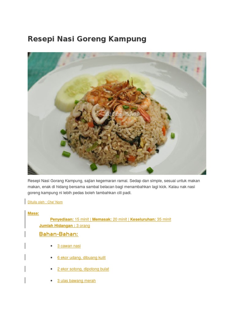 Sering kali, kampung nasi goreng akan mempunyai bayam air sayur di dalamnya dan dihiasi dengan keropok dan irisan timun cara buat nasi goreng kampung simple dan mudah. Berikut kumpulan rahasia aneka kreasi dan variasi olahan resepi nasi goreng jawa ala abang abang pinggir jalan masakan kampung sajian sedap istimewa. Sedap dan simple, sesuai untuk makan makan, enak di hidang bersama sambal belacan bagi menambahkan lagi kick. Berikut resep nasi goreng kampung sesuai buku resep andalan ny. Haluskan merica, bawang merah, bawang putih, tambahkan garam dan micin.